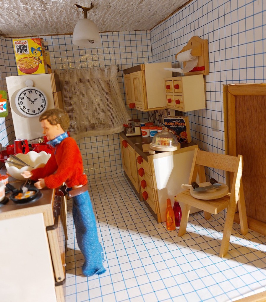 1980er-Jahre und der Mann steht in der Küche? Die Mama hat die Kinder am buchstäblich "abgespielten" Bein und darf sich ausruhen